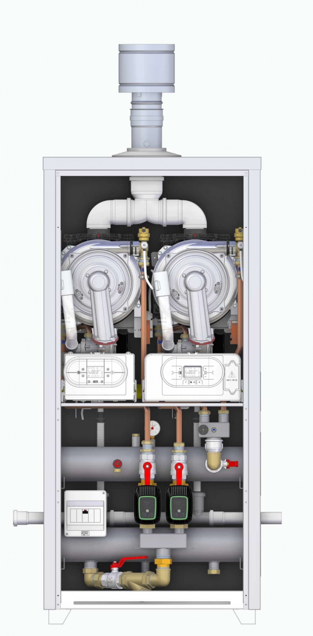 Высокоэффективные конденсационные модули, предназначенные только для отопления с мощностью 50, 60, 75, 100 и 120 кВт, которые могут быть объединены с отдаленными бойлерами для ГВС для мгновенного производства горячей воды.